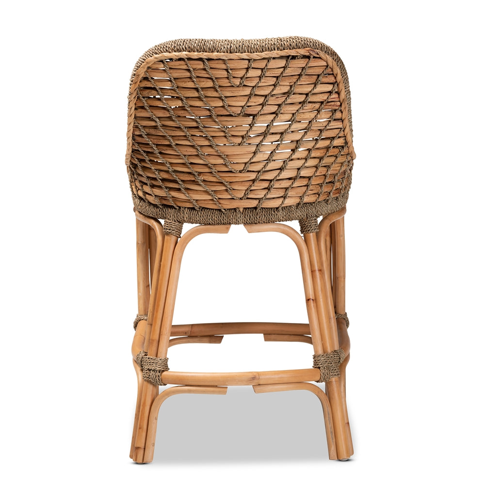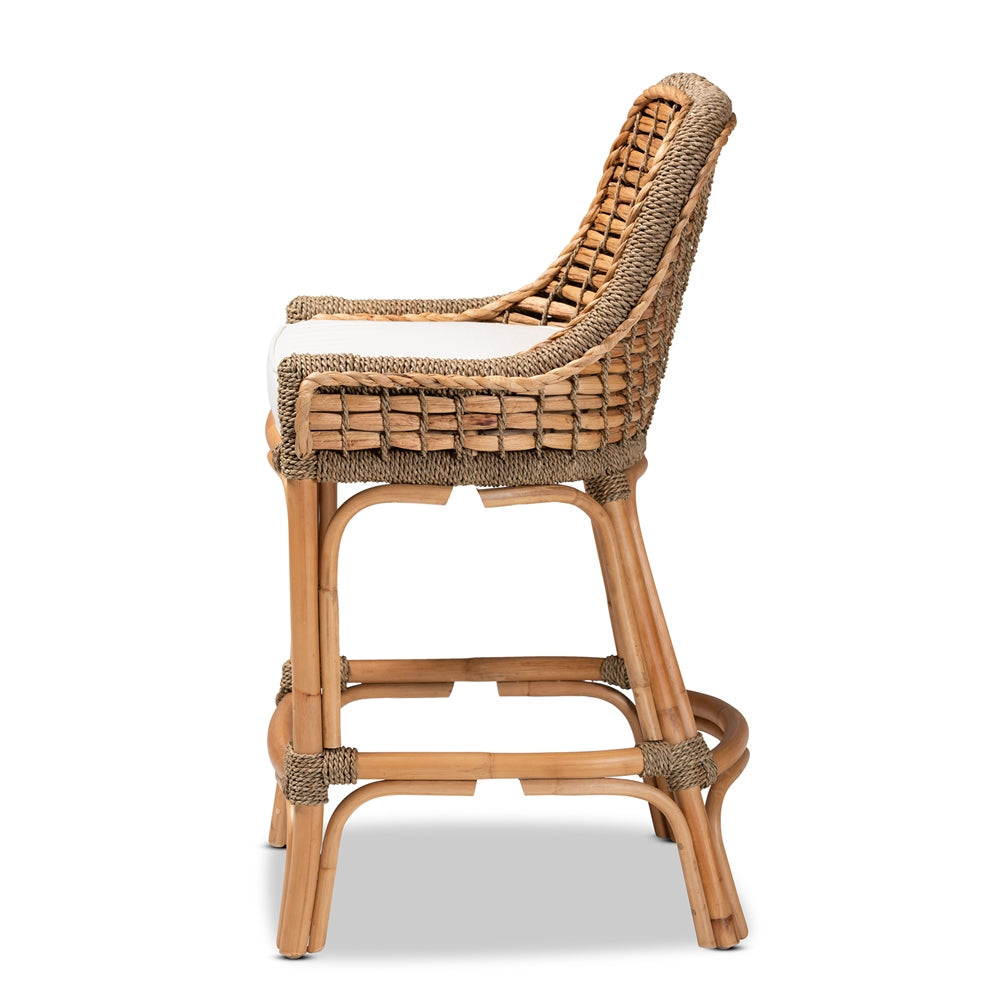The Sammie Boho Counter Stool is comprised of natural rattan semi pole frame embellished with handcrafted seagrass weave. Its seat features a removable fabric upholstered cushion. Arrives fully assembled.