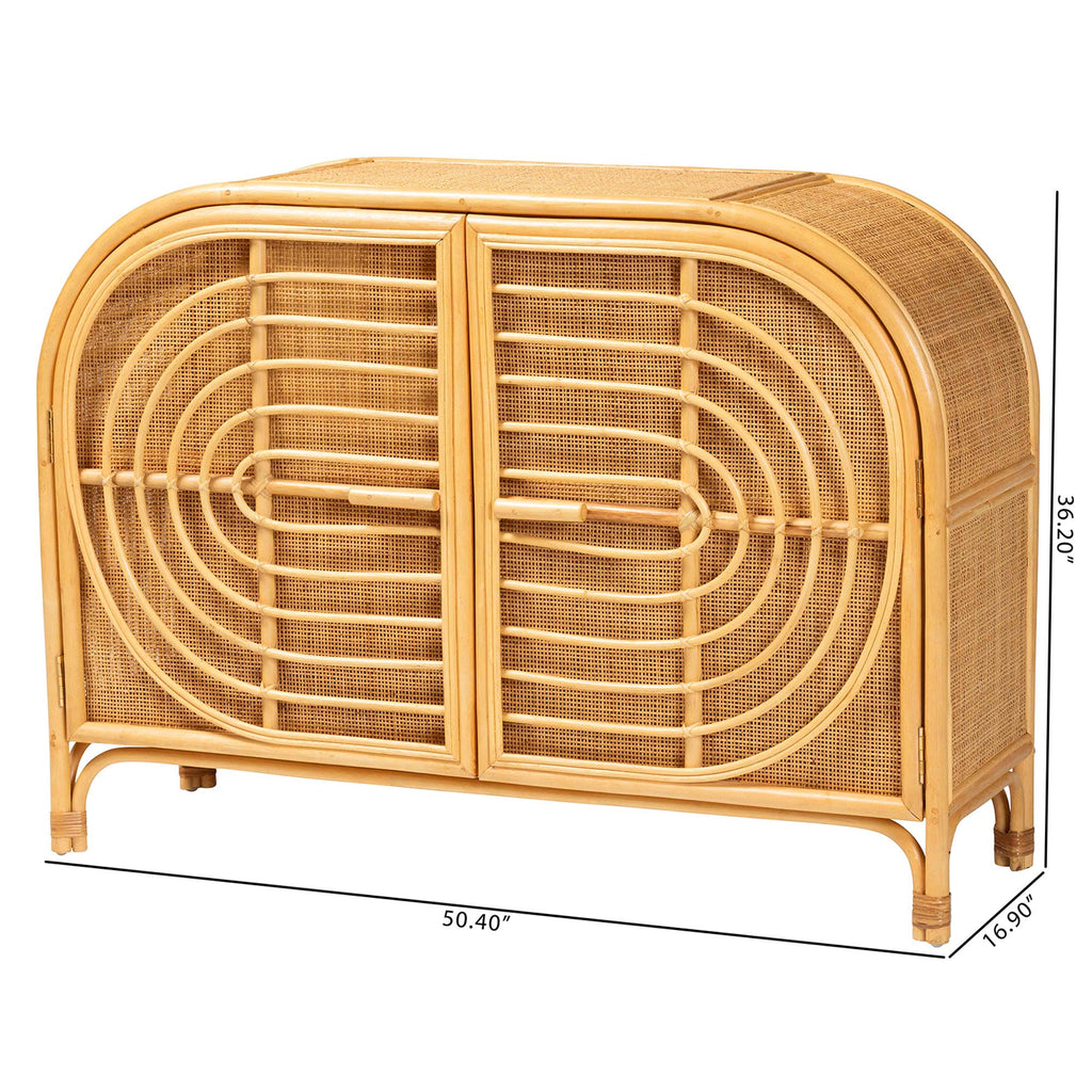 Refresh the potential of your space with the exotic Ovi Boho Sideboard. Handcrafted from natural rattan, the unique design features woven rattan cabinet doors embellished with a smooth geometrical design for an eye-catching display. With two spacious shelves, the Ovi offers plenty of storage. Arrives fully assembled.