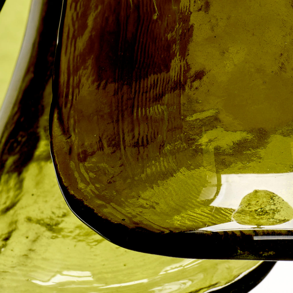 The shades of these artisan-crafted pendants were inspired by the fields of calla lilies that bloom wild in Big Sur. Featuring gracefully curved leaves in green glass rimmed with a touch of metal, they hang from an adjustable antique brass rod and canopy.